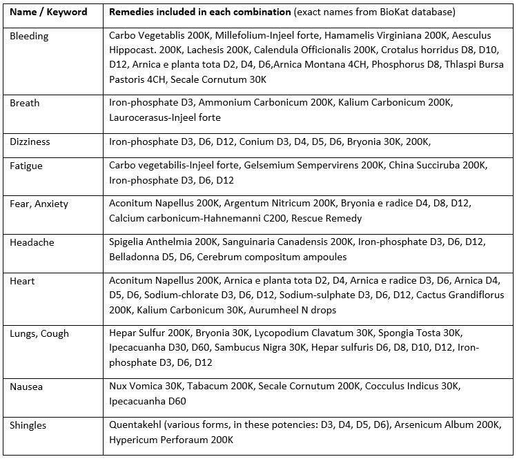 The contents of each remedy combination are listed below, so that you can assemble them yourself to make kits or remedies for your clients, even if you do not have training in homeopathy.