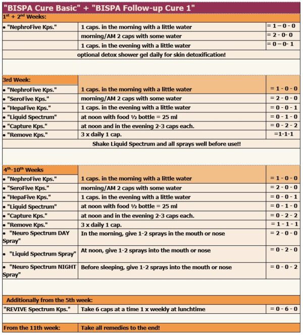 The naturopath Michael Gerling has developed a simple and standardized intake plan from this. He refers to the procedure as “BISPA-KUR” (Bi=Binding, Sp=Spike, A=Detoxification)*
