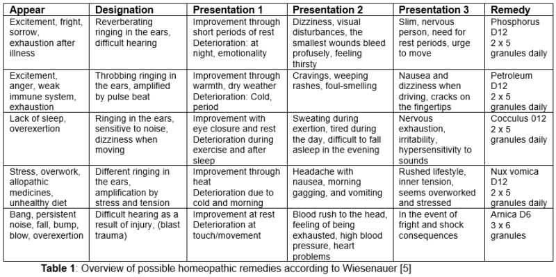 Homeopathy requires a detailed social, family, environmental and life situation anamnesis and therefore requires a deep examination of the client’s stories. Wiesenauer (2024) advises differentiating the ringing in the ears based on their characteristics and occurrence and asking for additional factors (Table 1)[5].