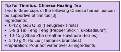 The use of TCM remedies in particular should not be done on your own, but only after consultation with experts. For tinnitus, black sesame in the form of pills, powder or paste is a good choice. In addition, chrysanthemum is also recommended as a decoction, tea, juice or paste. With all herbs, allergic reactions may have to be considered.