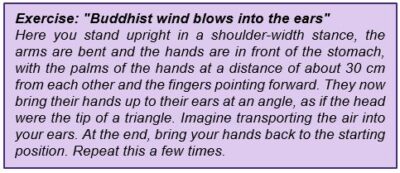 Depending on the type of constitution, gentle and flowing movement patterns, such as those found in Qigong, can not only bring inner peace, but also direct the focus away from the ringing in the ears. Wu and Lauer (2014) recommend the following exercise[3]: