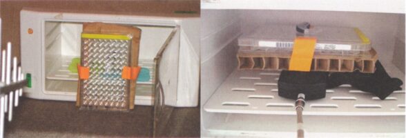 For the investigations cultivated connective tissue fibroblasts (Cell Line L-929) which were grown as mass cultures in a special culture medium at 37°C in a C02 [aeration] incubator were used. For the mass cultures the cells for the single experiments were seeded into 96-hole culture plates in pairs per experiment-beginning and after 24 hours placed into another special culture medium which maintained the pH consistency without further CO2 [aeration] in two mini-incubators. The two incubators were separated in two different laboratory rooms approximately 4 meters from each other. The respective active sending hearing aid pairs with the sending frequency of 2.40 GHz or 10.60 MHz were then laid in one incubator over and under the culture plate with the cells (Figure 2, next page) and there the electromagnetic radiation of the hearing aids was paused in different experiment-beginnings of 4, 12 and 24 hours. Then the cells were again incubated for a further 12 hours. The second incubator contained the untreated control cells. With an enzymatic test, which measured the activity of the mitochondrial enzyme, the cell vitality was finally identified.