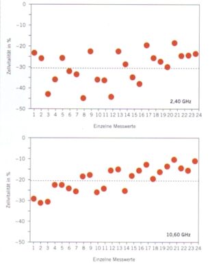 Figure 3: Graphic representation of a single measured value of the cell vitality after 24-hours exposure of the cells with the electromagnetic radiation of a hearing aid pair with 2.40 GHz (on top) and 10.60 MHz (below) in comparison to the untreated controls. In both cases the cell vitality is statistically significantly reduced compared with the controls (p <0.5; Wilcoxon-Mann-Whitney Test). The average value of the single measurement is made clear by the sketched line. Detailed explanations in the text.