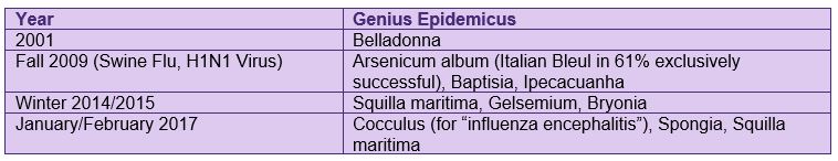 - Michael Frass and Gerhard Resch (Austria) suggest Lobelia purpurascens C200 as the Genius epidemicus (data situation unclear)